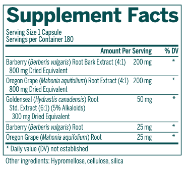 Includes a blend of barberry, Oregon grape and goldenseal. Provides traditional support for intestinal health and microflora balance.